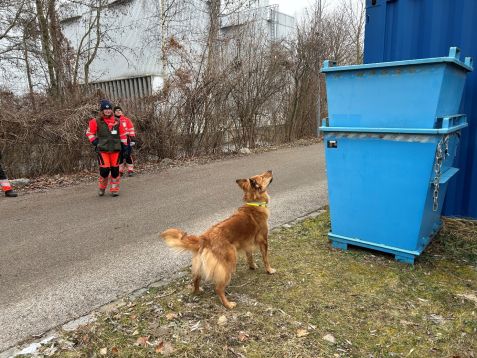 Lucy immediately picks up the scent and pulls Tanja Kosjak behind her past a blue container. “We lead the dogs to the place where the person was last seen,” explains the veterinarian and trained dog handler. Lucy is currently the only fully certified rescue dog in the mantrailing division of BRH Rettungshunde Erdinger Moos. BRH stands for Federal Association of Rescue Dogs. Twelve dog-human teams are currently in training, and six certified area search dogs are already available for deployment, explains Ella Hufnagel. Some of the dogs present today are already “in well-deserved retirement,” as Ella Hufnagel puts it, but they still practice with the others.