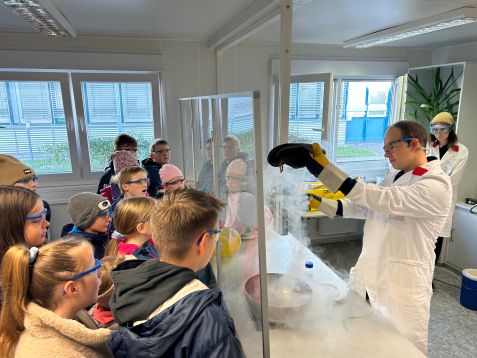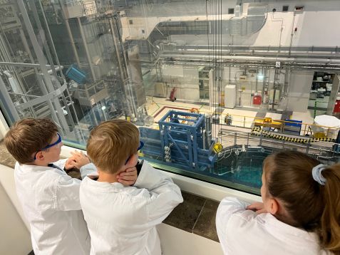 Ten-year-old Annika from Neuburg an der Donau set her alarm for 6:30 a.m. so she could be at the research neutron source on time for the first Maus children’s tour at 9 a.m. She was most excited about the freshly made banana ice cream that was served after the demonstration of the experiments with nitrogen. In addition, the 15 mice between the ages of seven and 13 constantly peppered their guides with questions. Annika was more interested in the tangible things: “Why is there a lifebuoy?” she wanted to know, for example, when looking at the reactor pool. The children quickly understood that lifebuoys are required for safety reasons when there is an open water surface, even if it is not intended for swimming.