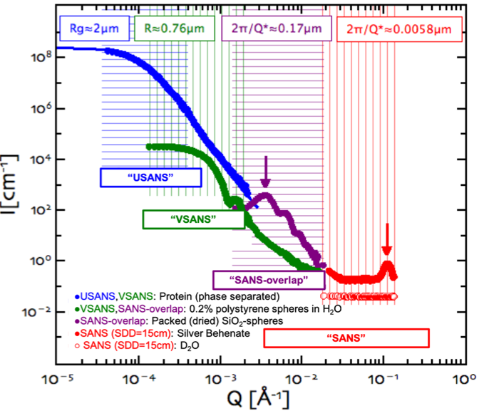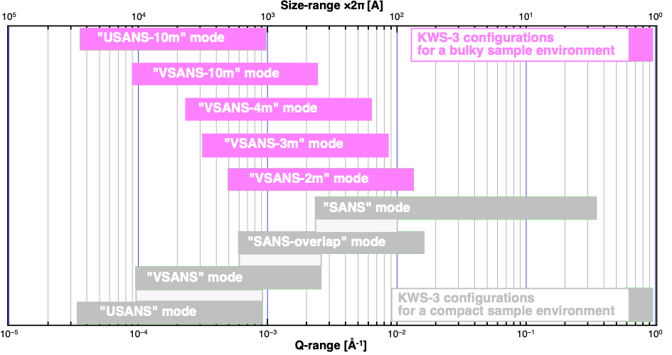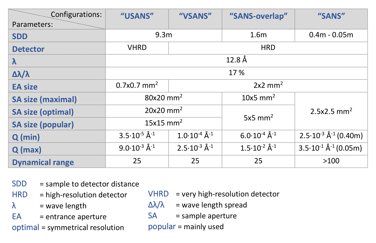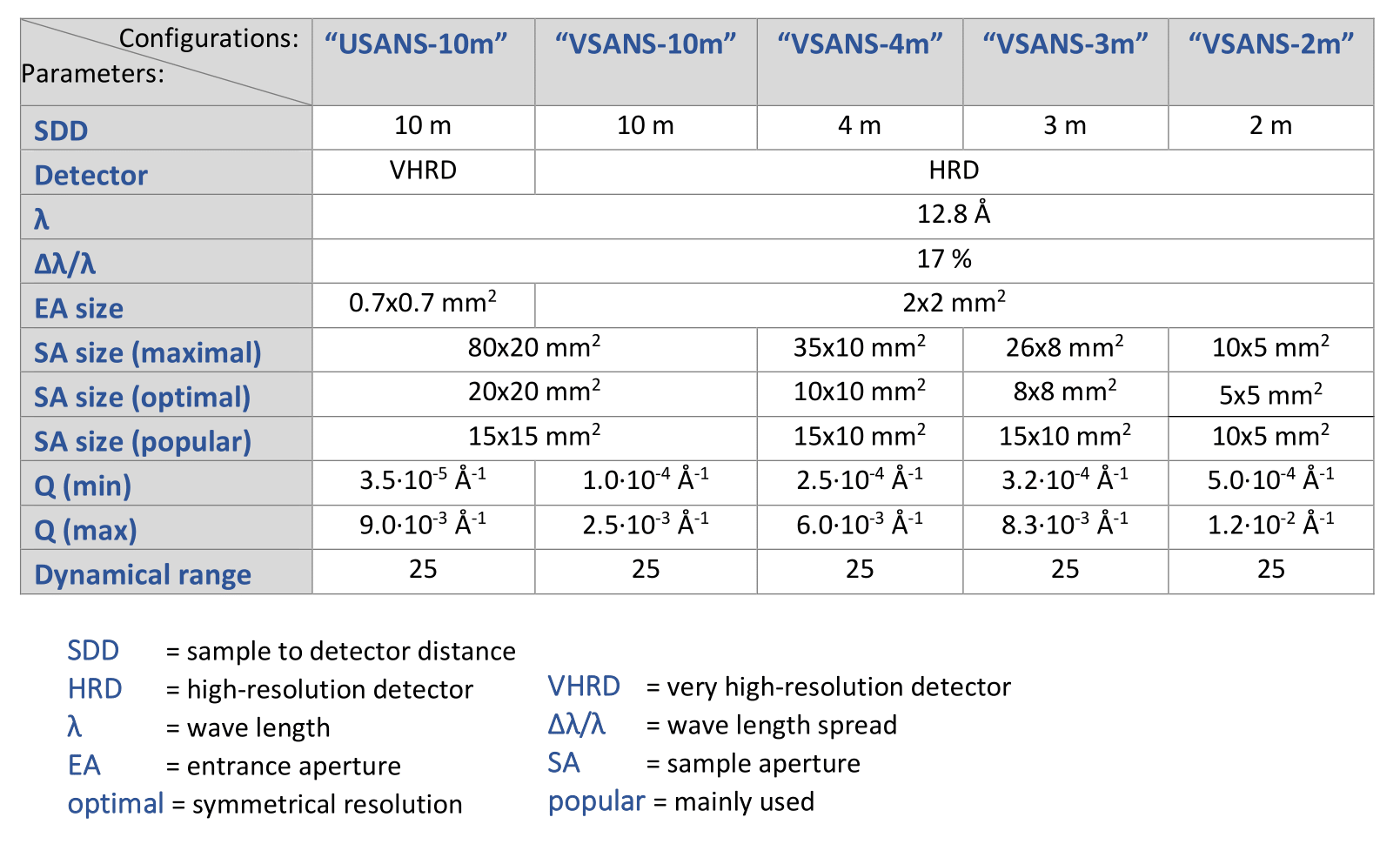 The instrument’s standard configuration “VSANS” with a 9.3 m sample-to-detector-distance (SDD) and 2 × 2 mm2 entrance aperture (EA) allows performing scattering experiments with a wave vector transfer resolution between 1.0 ×10-4 and 2.5 ×10-3 Å-1.